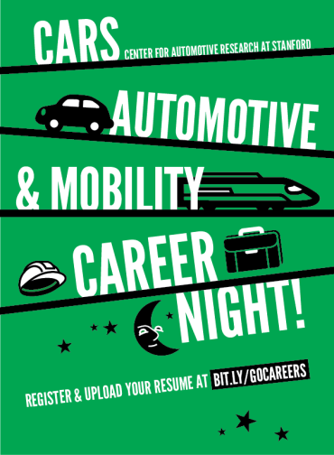 CARS and BEAM, Stanford Career Education invite you to CARS Automotive Night on Monday, Oct 2nd from 6-7:30pm. It's an opportunity to meet with PhD, masters and undergrad students from a variety of academic disciplines and all with an interest in the automotive industry. Students attending will be seeking intern and full-time positions. Deadline to register is Friday, September 8th and the event will be capped at 15 employers. Please register here.